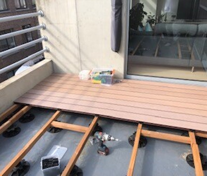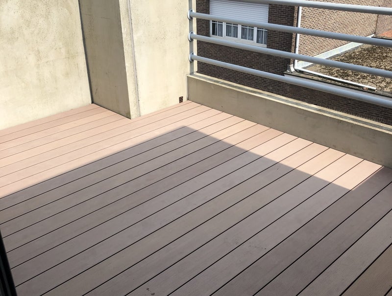Balkonrenovatie: Nieuwe waterdichting van Sika Decothane Balcons + afwerking met composiet vlonderplanken Twinsol van Deceuninck te Hoboken.